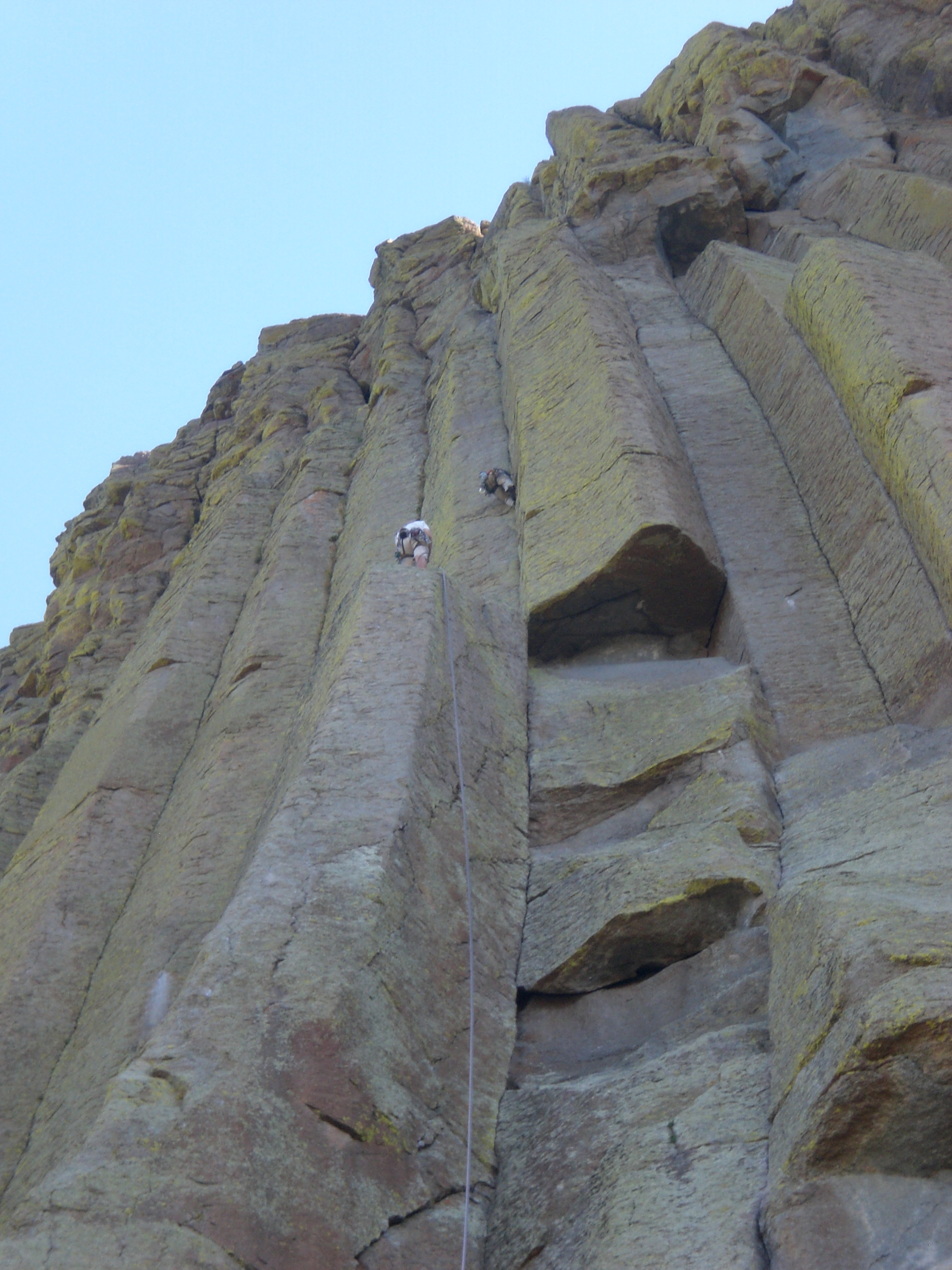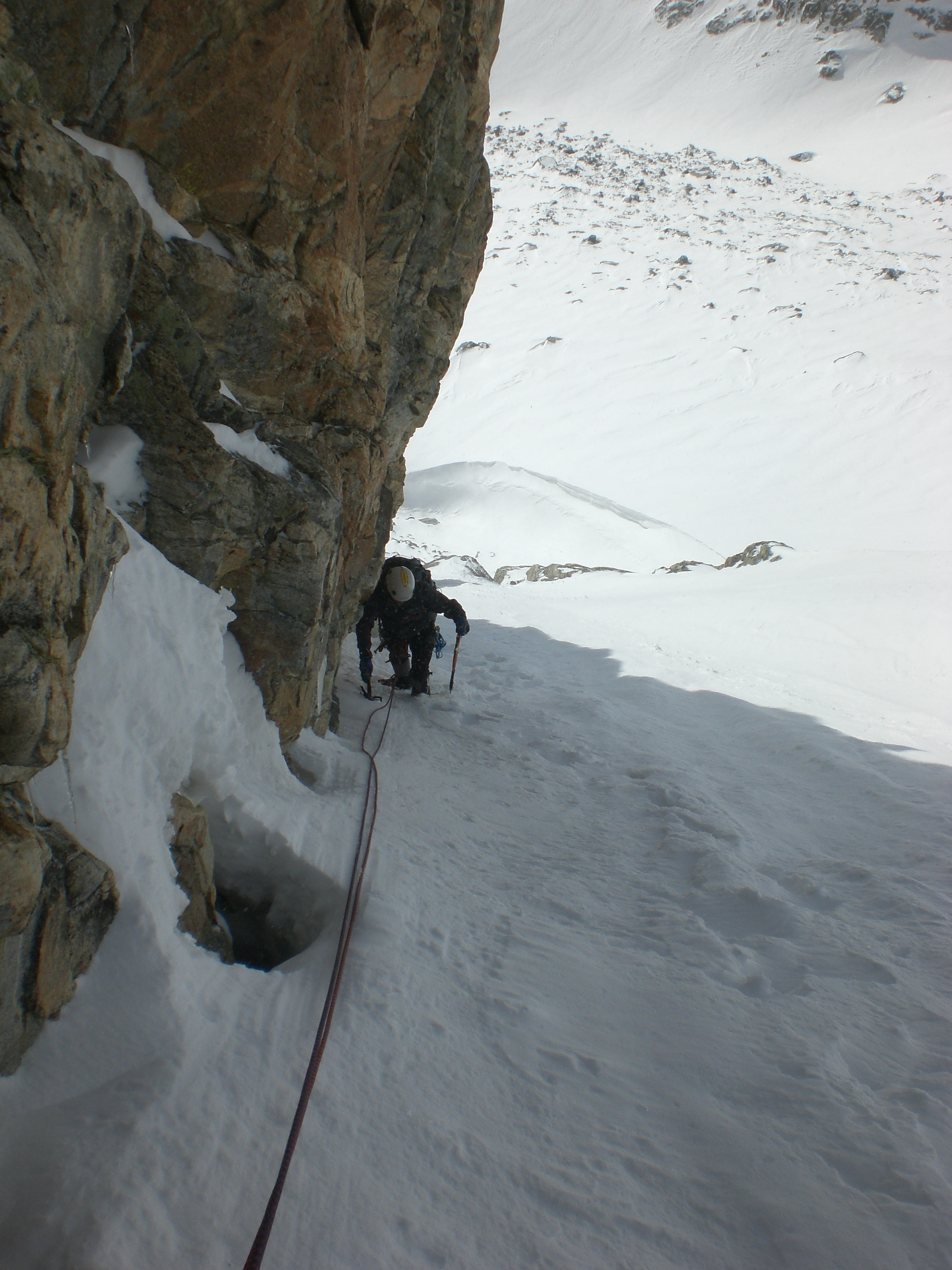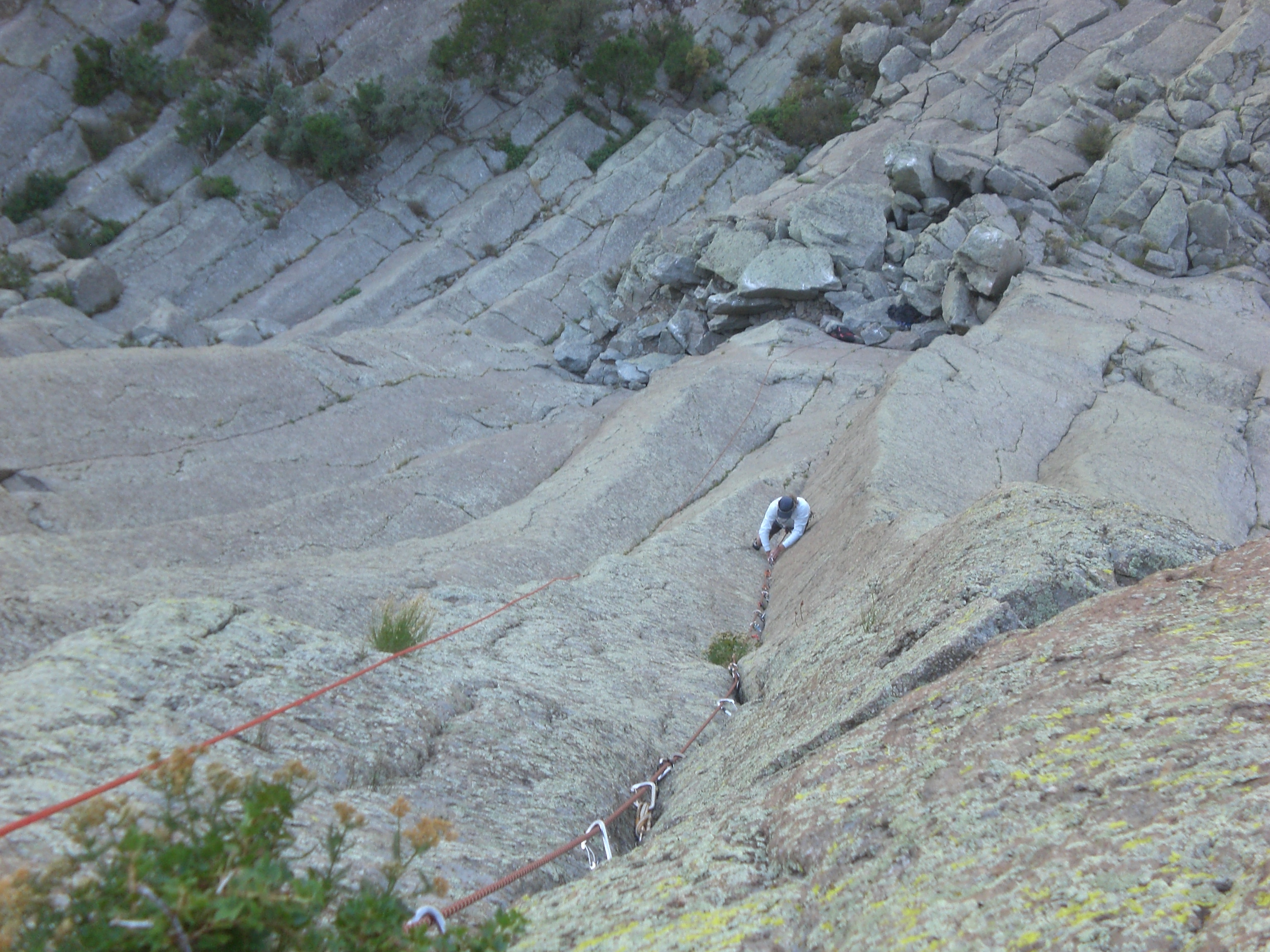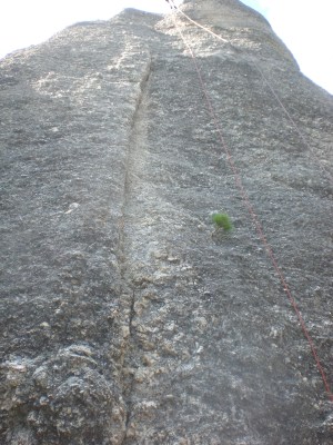 The key to the whole trip up this climb is the third pitch. It gets sun in the morning and the top will disappear in warm, consistently sunny weather. It is visible from the road, if you drive a couple hundred yards past the parking spot for the approach.
