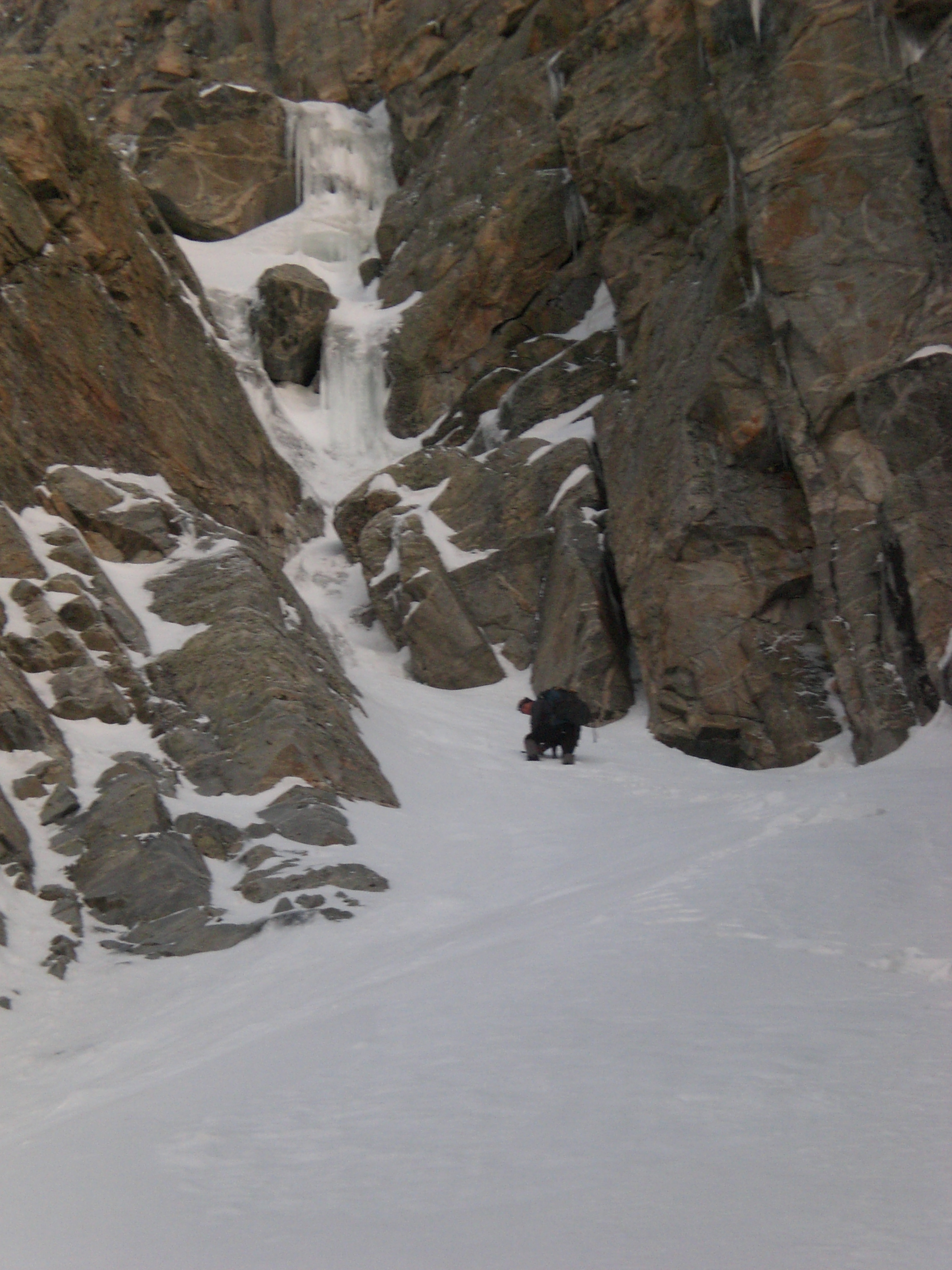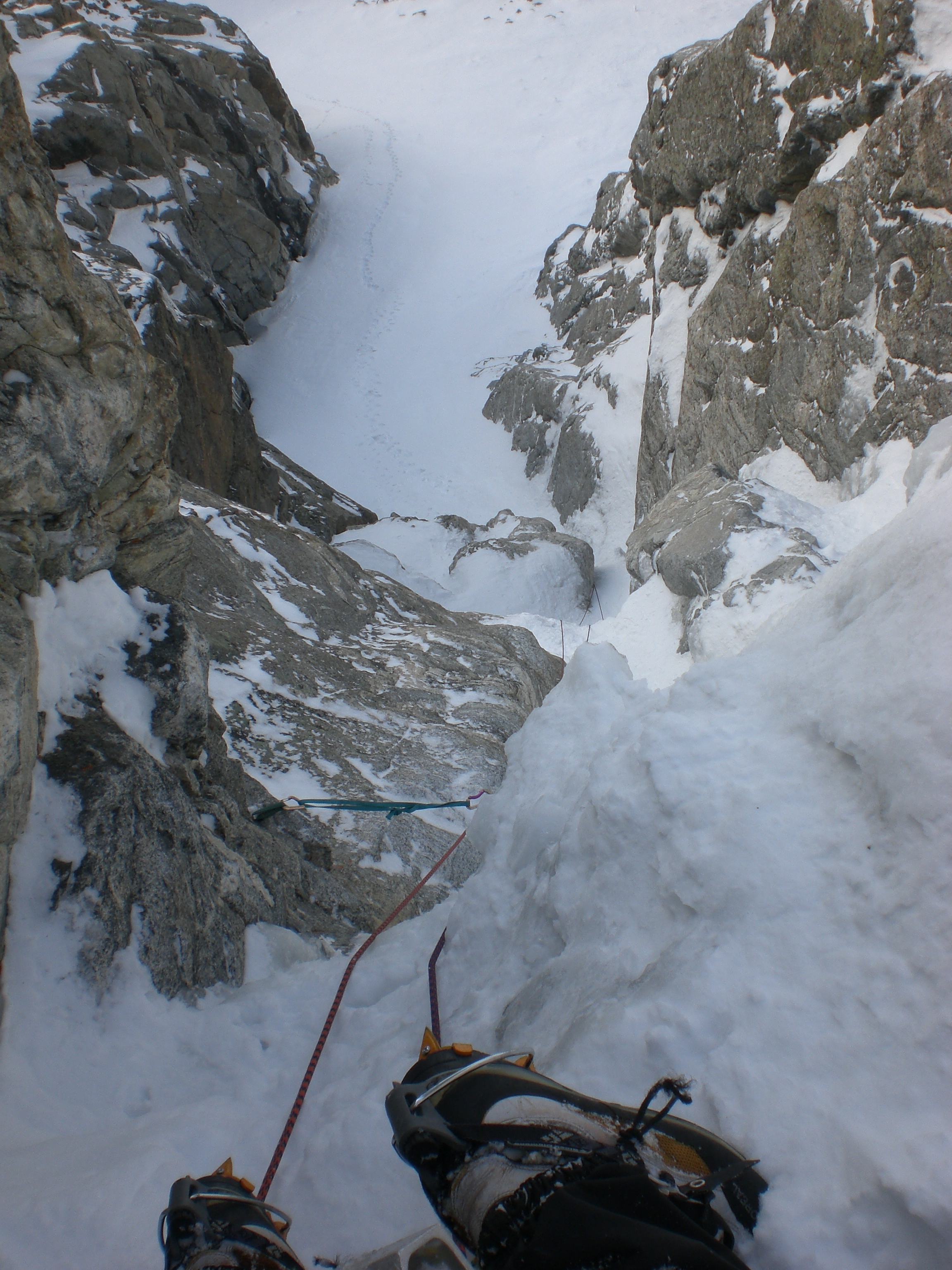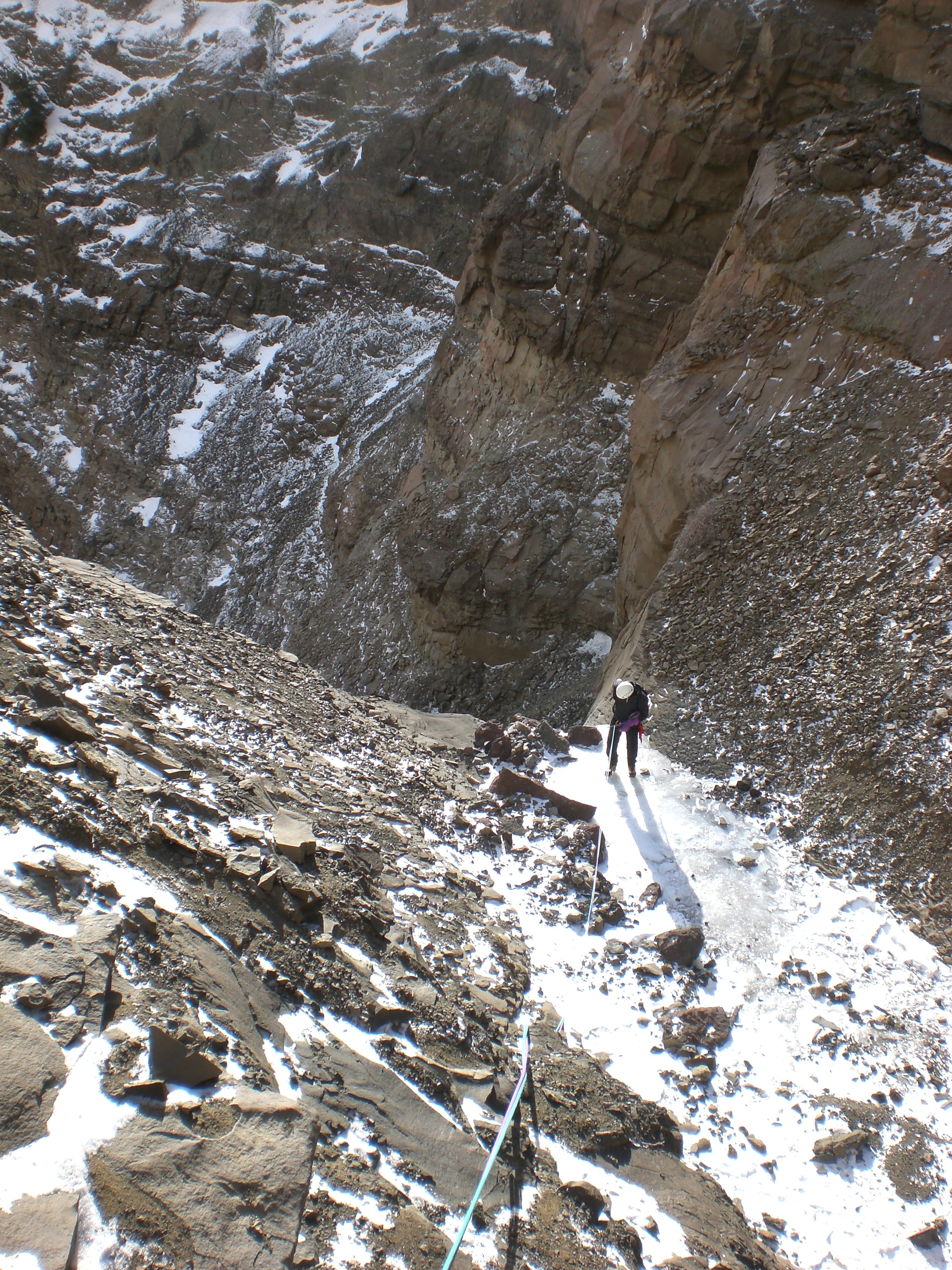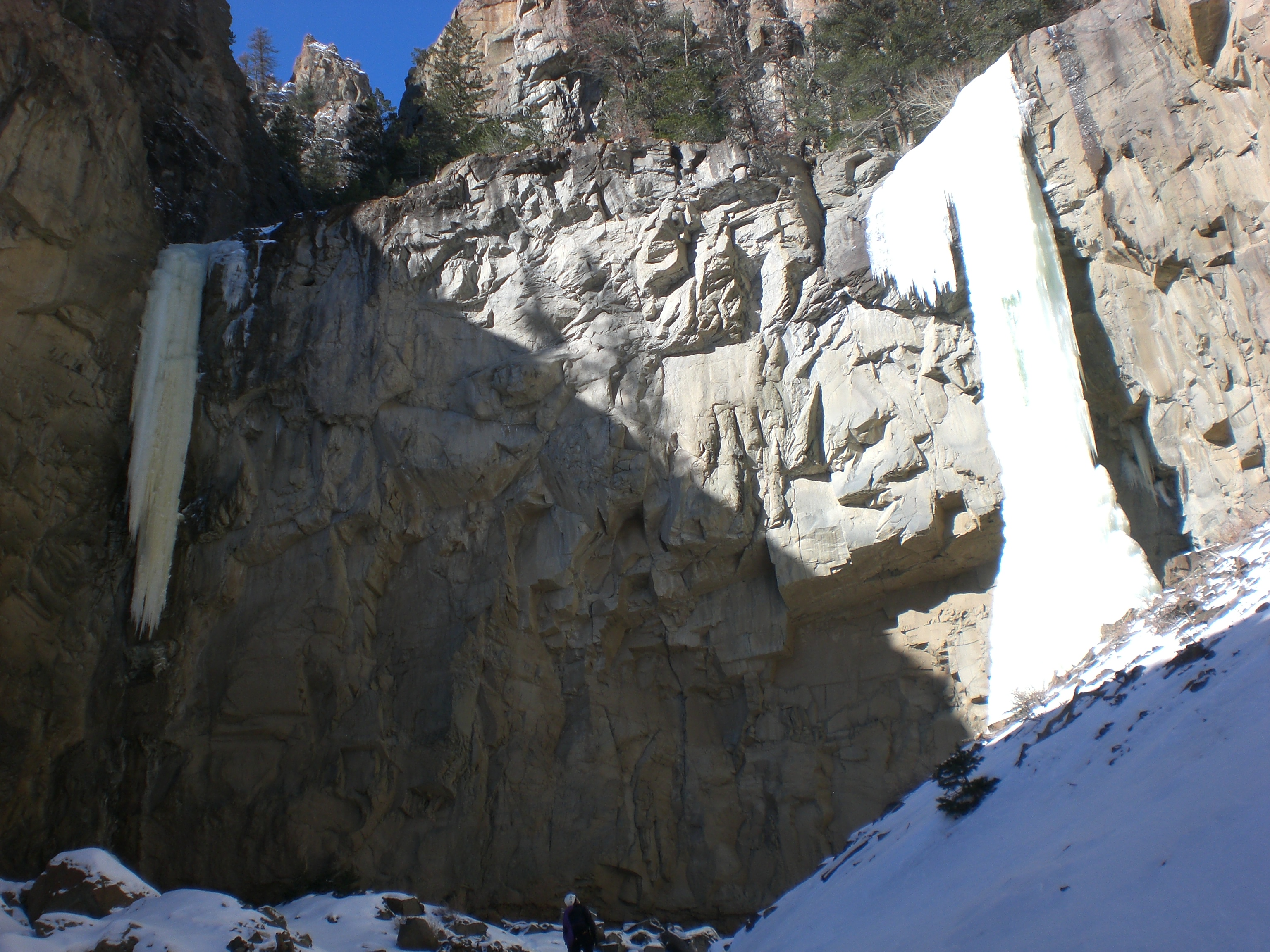 A few notes to supplement the guidebook Winter Dance, by Joe Josephson. The rappel anchor for pitch 3 is a tree high on the wall of the gully to climber’s right. The rappel atop the second pitch is from an ice anchor, check its integrity on the way up and be prepared to set your own or do the alternative descent if it looks dicey. Break the rap. down the first 2 pitches into two 30m sections, pulling the rope can be a frustrating experience otherwise. The ‘walk off’ described in the guide is feasible, but not trivial. It crosses some steep slopes and the break onto the ridge can be difficult to identify. Glass it before you try it and know that unless you have tracks in the snow to follow, it is the longer, more physically demanding alternative to descending the drainage.