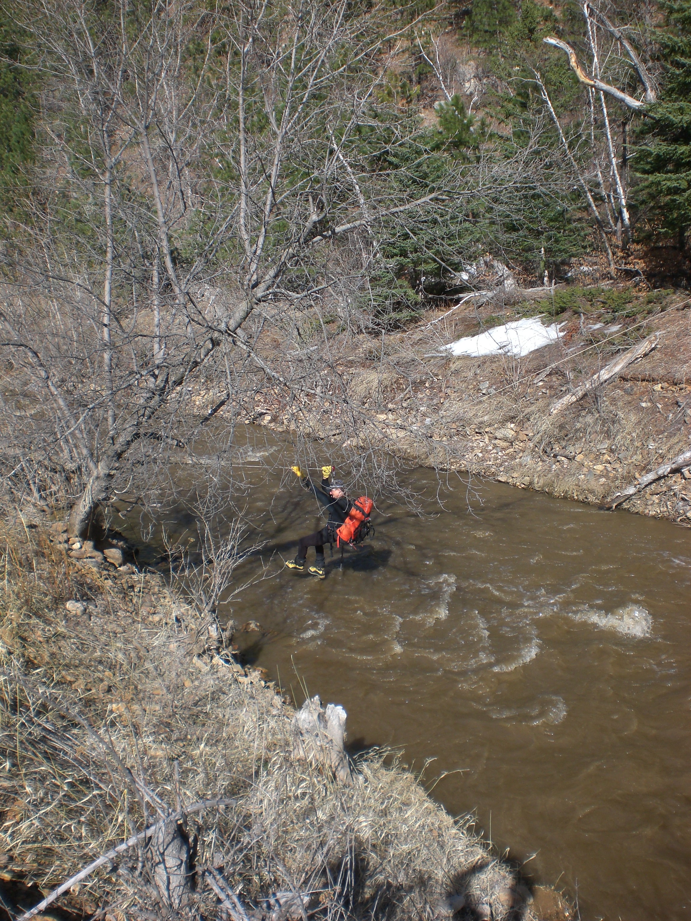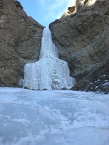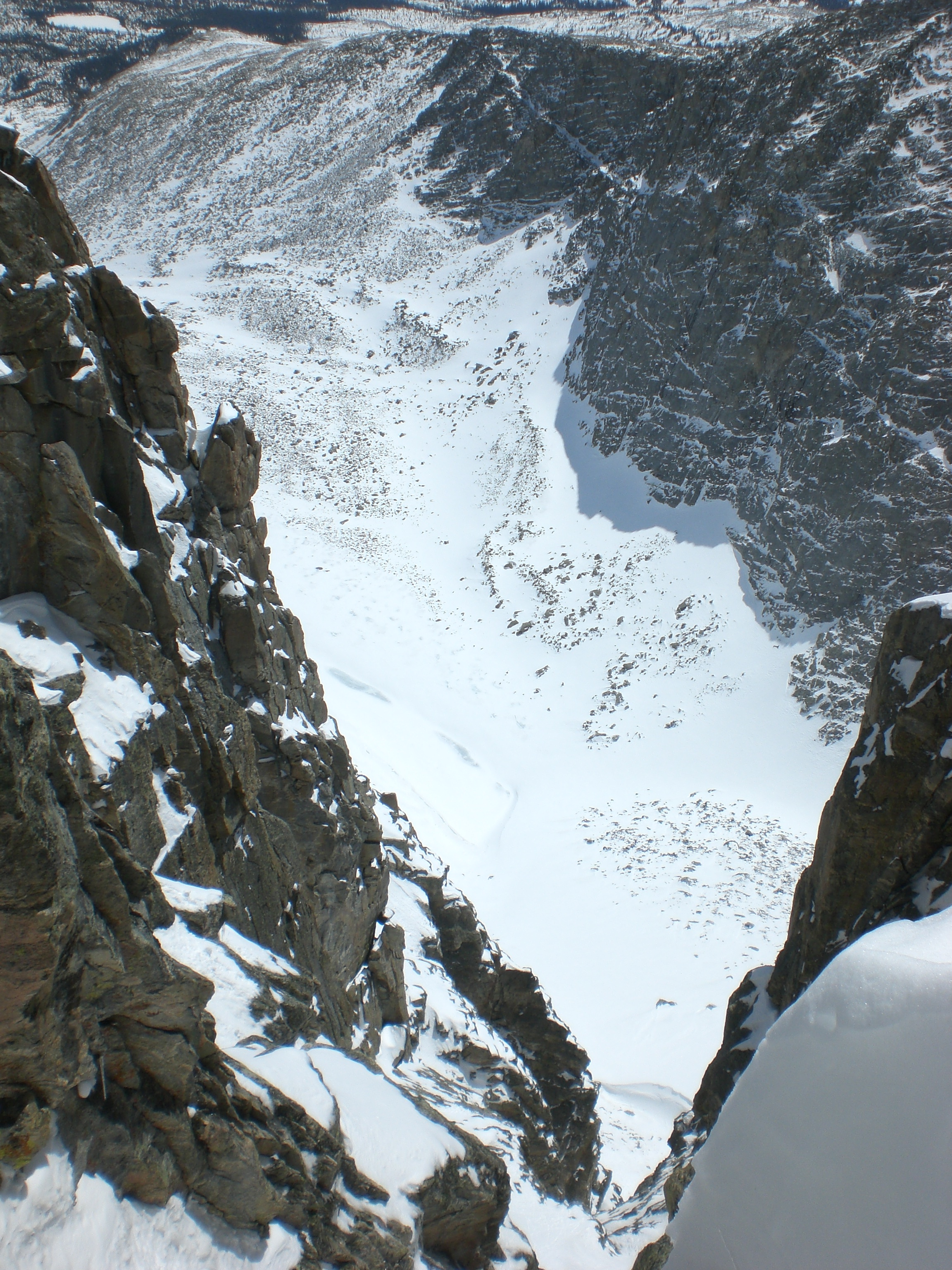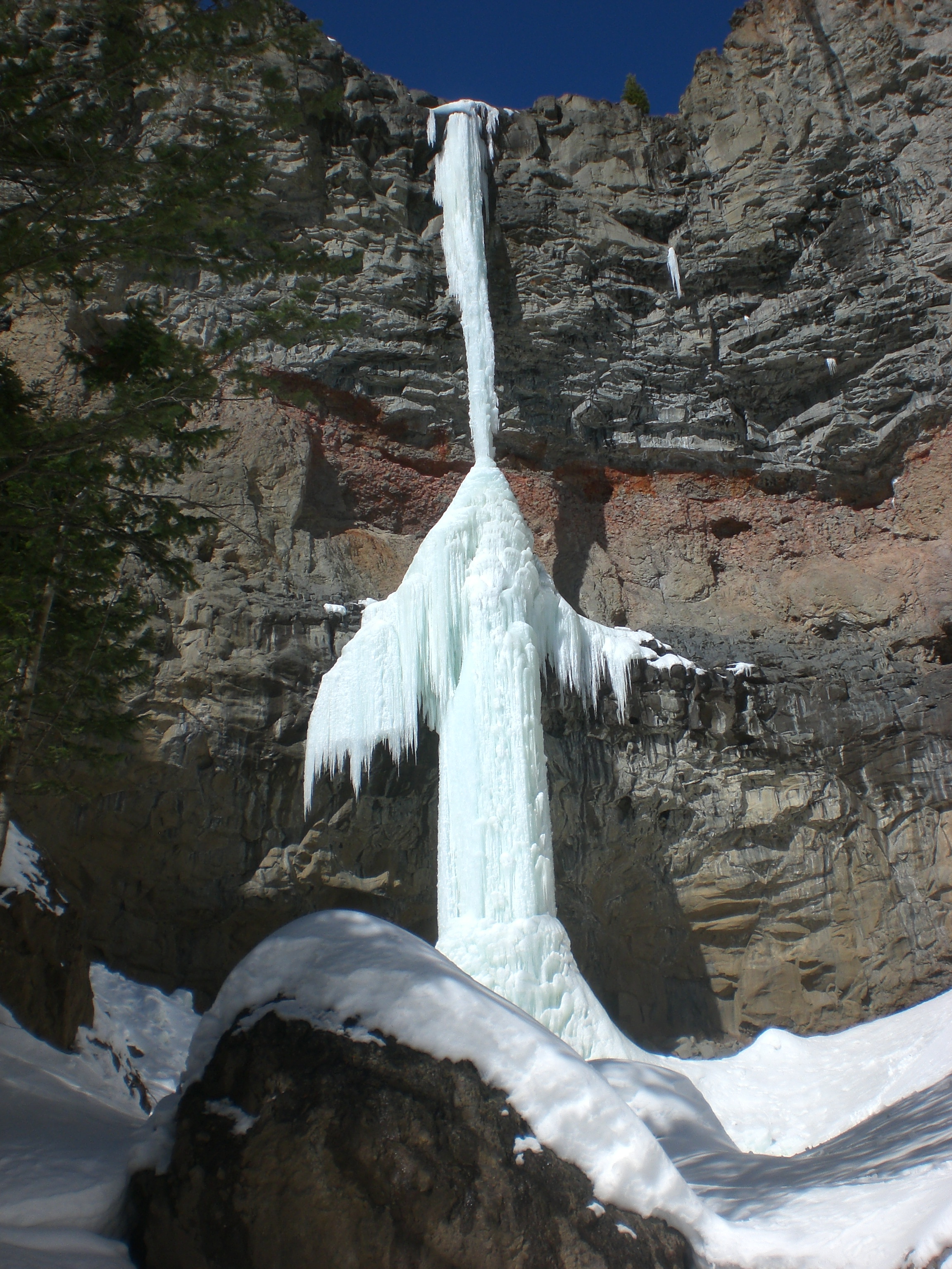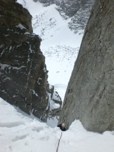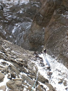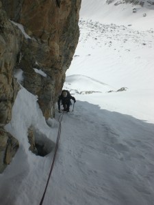 A few notes to supplement the guidebook Winter Dance, by Joe Josephson. The rappel anchor for pitch 3 is a tree high on the wall of the gully to climber’s right. The rappel atop the second pitch is from an ice anchor, check its integrity on the way up and be prepared to set your own or do the alternative descent if it looks dicey. Break the rap. down the first 2 pitches into two 30m sections, pulling the rope can be a frustrating experience otherwise. The ‘walk off’ described in the guide is feasible, but not trivial. It crosses some steep slopes and the break onto the ridge can be difficult to identify. Glass it before you try it and know that unless you have tracks in the snow to follow, it is the longer, more physically demanding alternative to descending the drainage.