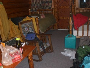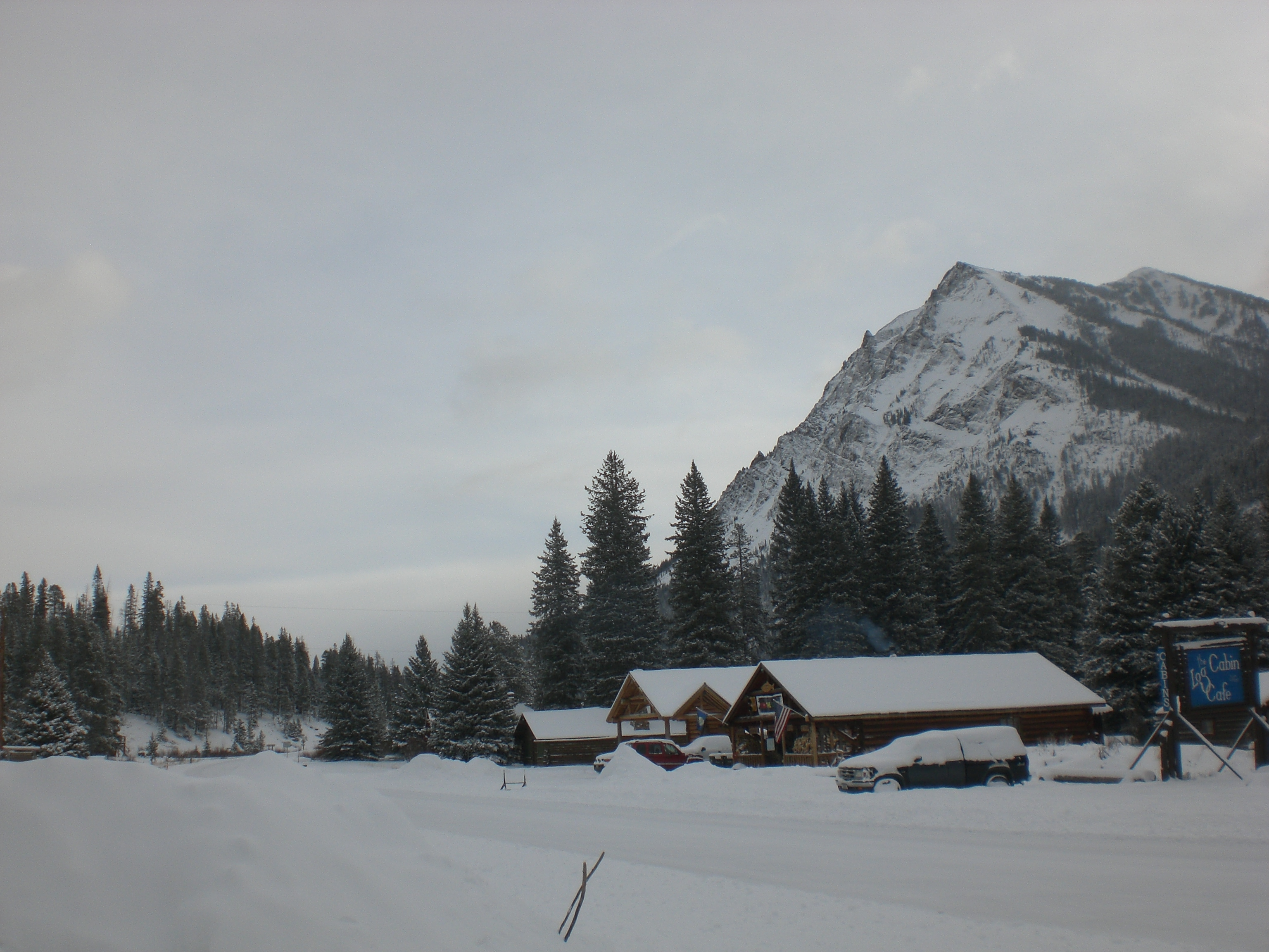 There’d been talk of camping earlier in the day. Jay said we might be able to get to some Forest Service land behind the dump. The visitors’ center lady had looked at us like we were nuts when we’d asked her about somewhere to set up a tent. The dump road was steep and it was snowing heavily when we got back to town. So, we shelled out for a cabin at the Pine Edge. Painful, but probably for the best.