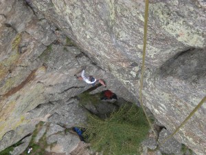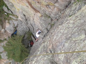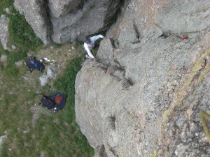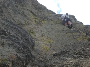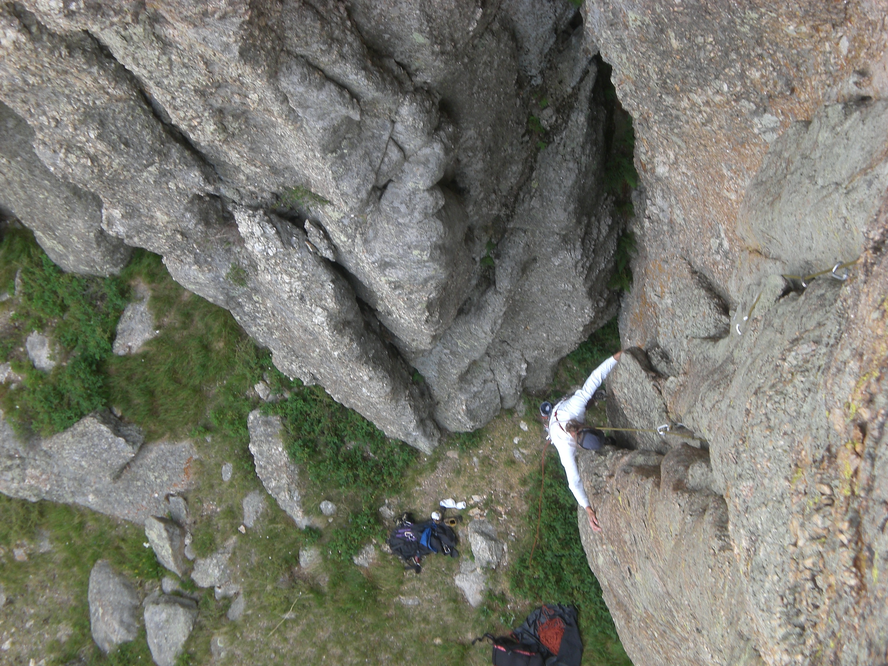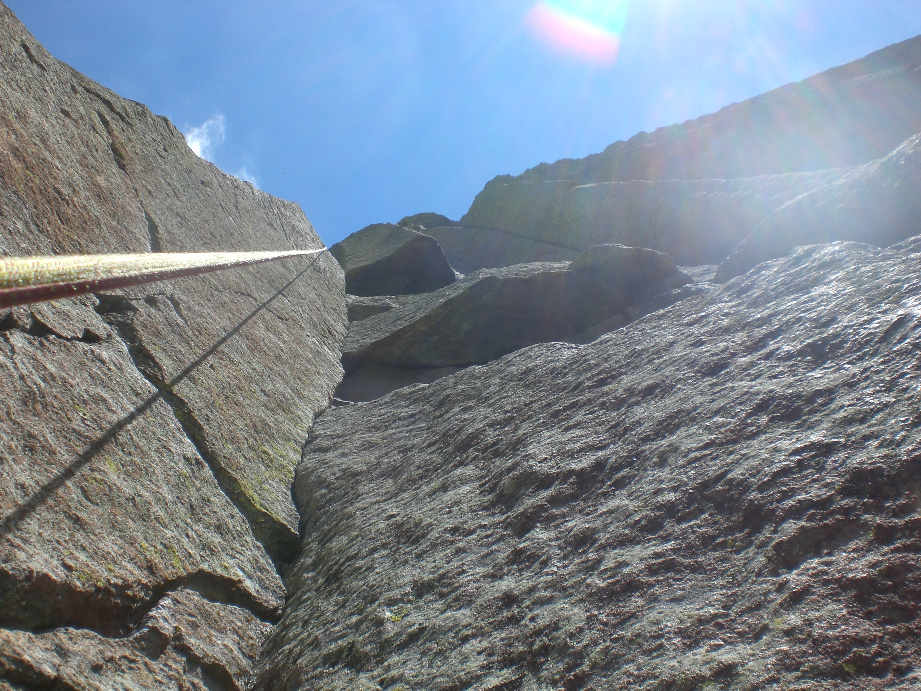 The climb continues up a crack in the corner to a belay out of sight on the right at the second set of  ledges. The pitch is long; the rap takes two ropes.