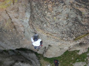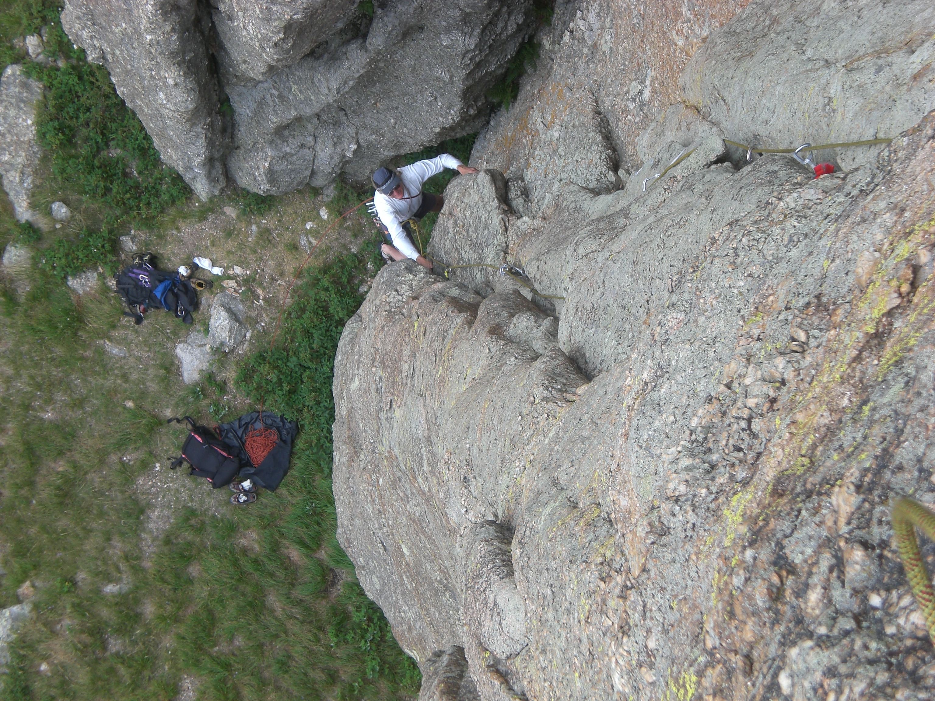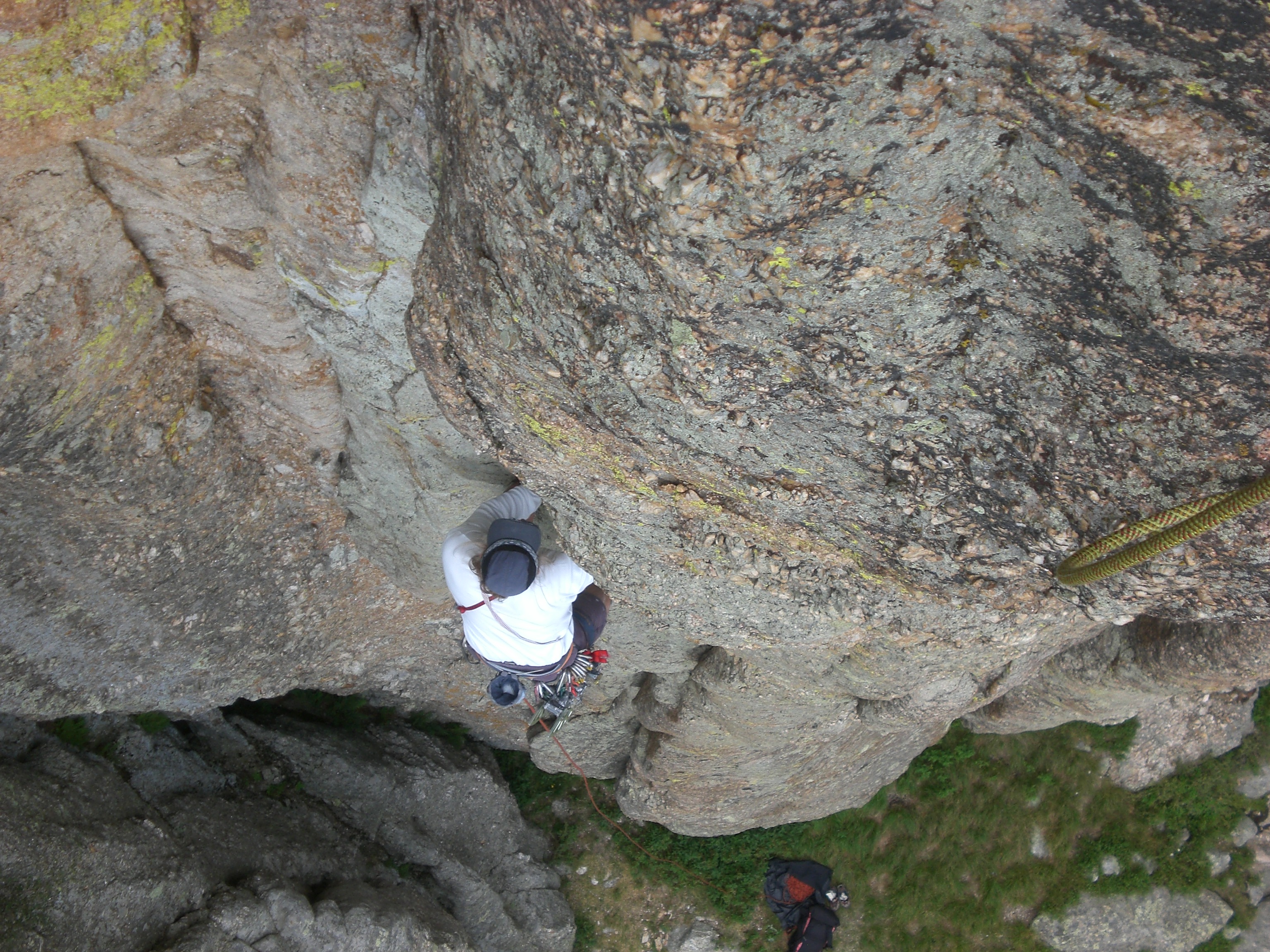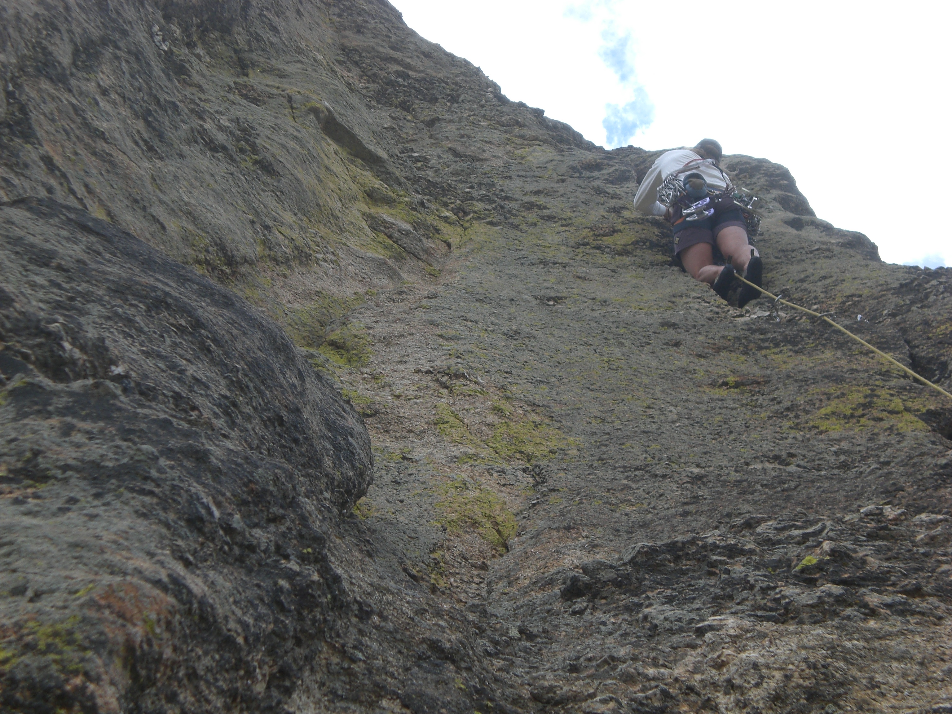 It starts with a dicey bit up an arête. A key pink tricam placement makes this section much less dangerous.