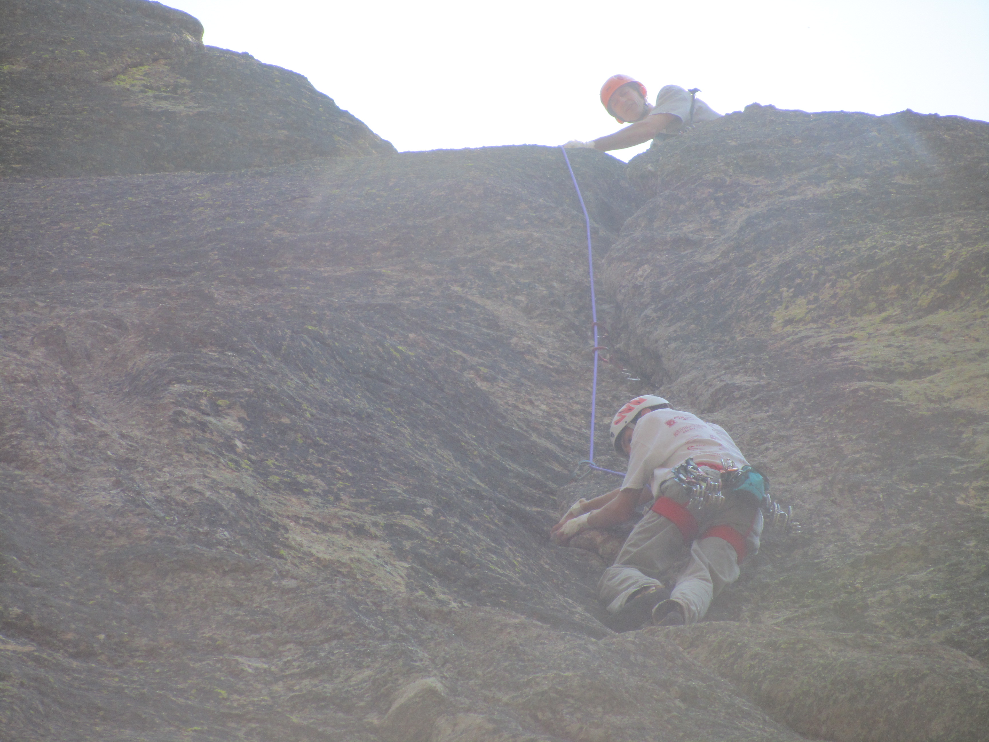 A team from Boulder, CO was climbing up to the awful hanging belay on Soler, a climb every bit as good as any at their home crag. A pair from Montana was queued up right behind them. We would watch the two teams try to share the bolts at the unsupported stance as we left. At the other end of the ledge, a guided group of four was climbing the easiest route from the ledge, aiming for the summit.