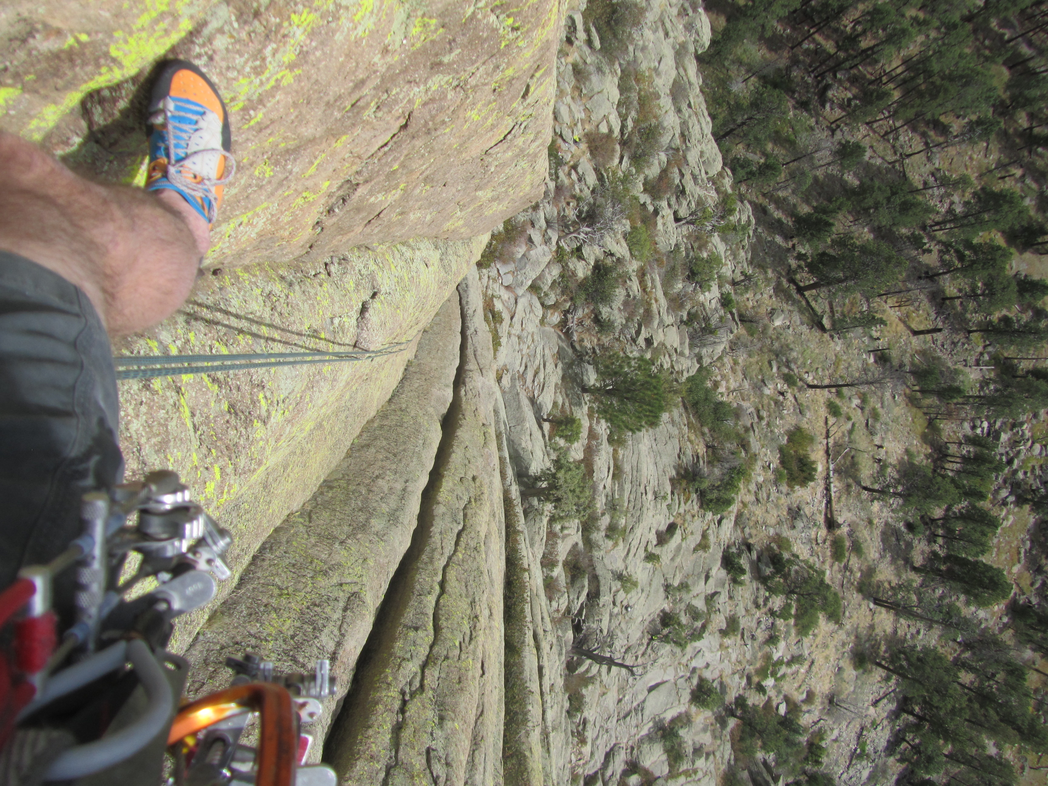Only one group of locals attempted to enter the real climbing event. That event was not ill-conceived. It capitalized on the history of the Tower as a bastion of traditional climbing by challenging participants to climb a route with passive gear only, and film the ascent. The best movie would win a new rope for the artistes. The only takers made a valiant effort. My partner and I spoke with them as they were headed up to climb Walt Bailey Memorial. We climbed a nearby route, Double Indemnity, so we could hear them all the while. It seemed to be going well, so we were surprised to see them all looking glum at the base of the rappels. Upon inquiry, the cameraman simply held up his iPhone, which he’d been using to record the leader’s success. It had fallen out of his pocket 250 feet above, at the start of the rappels. Even Gorilla Glass has its limits. The phone still came on, so they hoped to download the movie. But it was not to be. Chalk one up for the Luddites; the new rope went unclaimed.