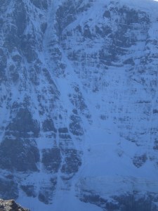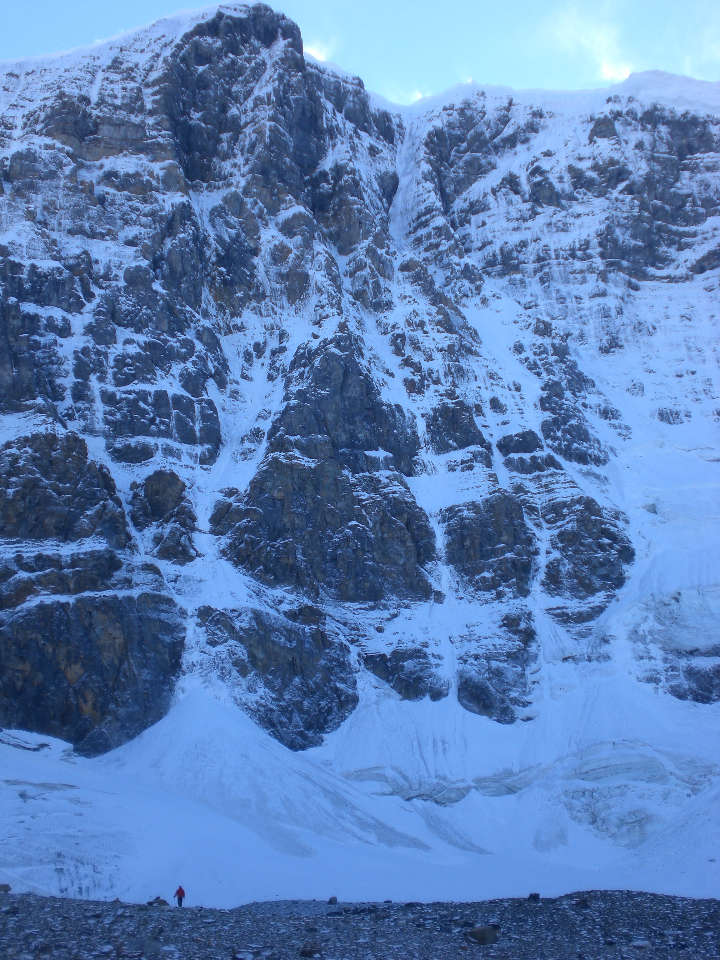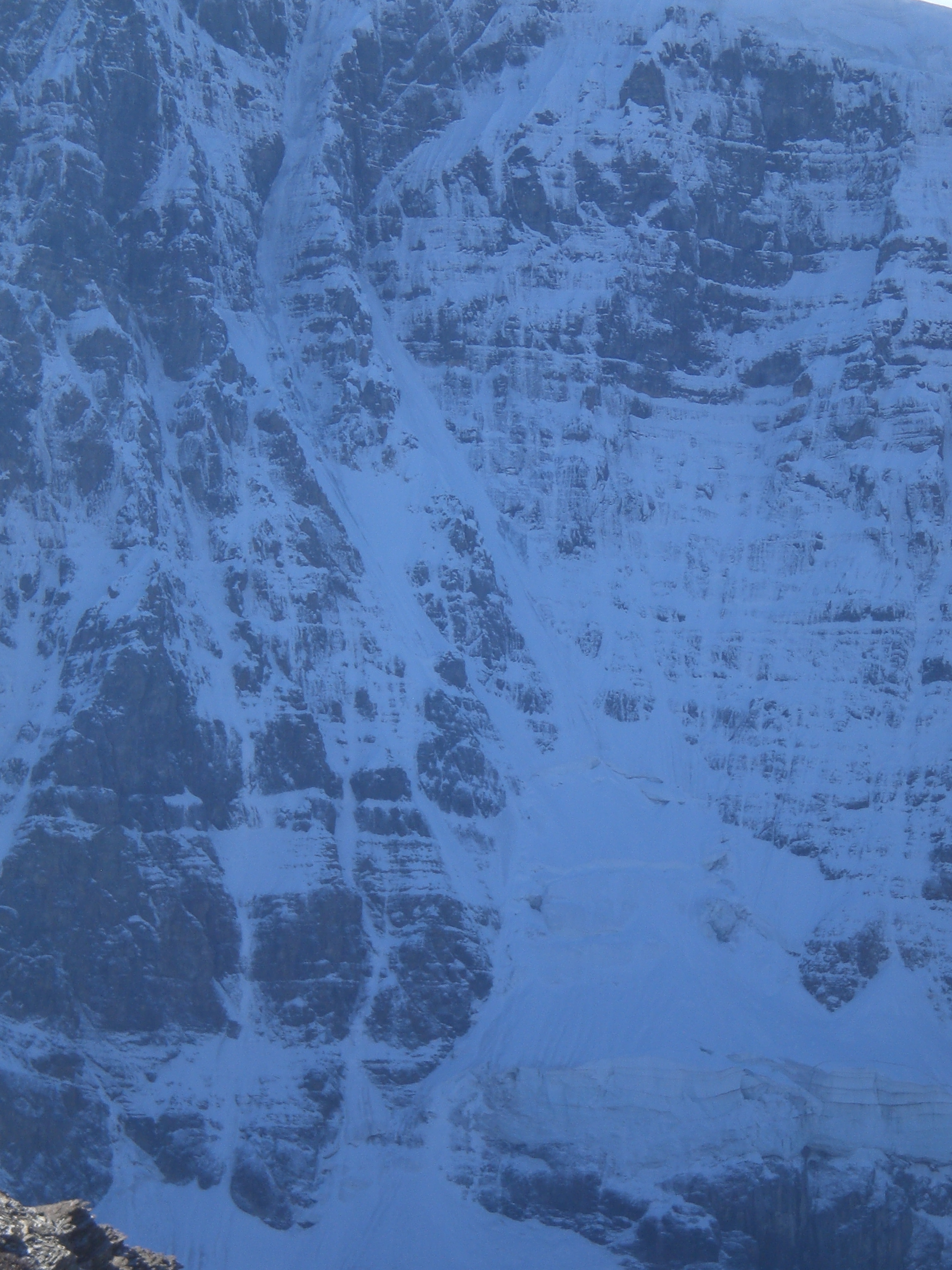 The Grand Central Couloir is a beautiful line, and one of its enticements is the order of the difficulties. The higher in the couloir, the steeper the climbing and the greater the exposure. But that arrangement also ensures tired calves and hands at the crux. The crux is a steep wall where the couloir degenerates to a rock corner (the course of the first ascent) flanked by a blank face on the right, which is breached by an ice-filled groove (the Doyle-Blanchard ice strip, the course of most subsequent ascents). We had certainly felt up to it that morning. I had rested well, Chad less so, but well enough (his sleeping bag was a little lighter). The walk across the dormant glacier on the approach was a nice, gentle warm-up. Crashing ice calving from the 300-foot serac above sharpened our focus as we neared the hanging glacier that forms the bottom section of the route. With headlamps in spotlight mode, we picked out a passage through the lower ice cliff on the far left. For about an hour, we felt our way through the crevasses and bergschrunds, hugging the left margin of the ice. Then things got confusing. Small gullies began to appear, as well as larger fingers of ice and snow cutting into the cliffs. Fooled by the scale of the face, we worried that we had gone too far right. We sat down for a snack and waited for the light.