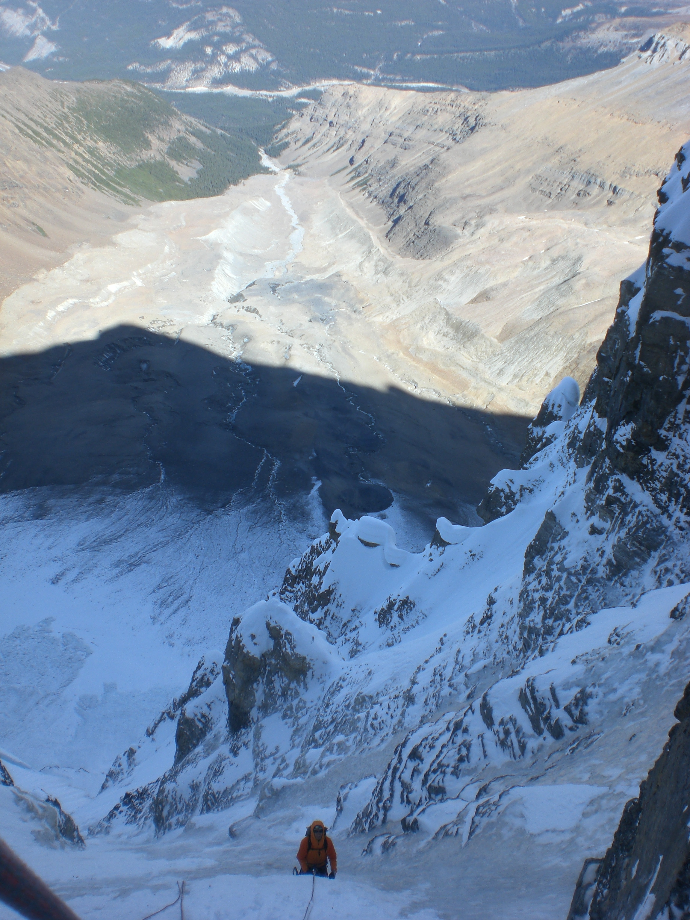 The next 15 feet go well and now I can see the rest of the way ahead. There is no ice. There is no ledge. My right foot rests on a slab inclined at about 70 degrees and composed of shattered black limestone which resembles nothing more than a mass of children’s alphabet blocks glued together face to overlapping face, all sloping down, of course. On the left, the corner now forms a fin with a sharp, crumbly edge. The crack in the back of the corner is a groove filled with yellow dirt/rock — shale I suppose. A couple of plates of the same stuff sit wedged in the groove above, the only visible opportunities for protection. It’s another 20-foot run out to get there. Surprisingly, I’m not scared, just mad. I try to hook on the blocks, climb the slab. My picks skate off repeatedly, so I clip the tools to the harness and grab the edge of the fin. I can’t keep enough pressure on my right foot as I move up and my front point and secondary point pop off the unfavorably sloped corners and edges, forcing me to hang onto the fin alone while I get my feet reestablished. I turn around to look at the underside of the fin. This solves the problem in the Guano Chimney on the Grand Teton, but not here. There are no holds, and the edge is too fragile to push against. I stand there for a few more minutes, my mind scrabbling over the options again and again, but I finally have to admit, I can’t climb this without risking a bad fall. I back down to the cam. Chad lowers me. Goodbye little yellow alien, we’ve been through a lot together, now you just have to do this one last thing for me. I’m so wasted, I don’t even consider whether or not the ropes will reach. They do, with a bit to spare.