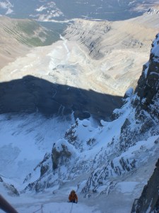 We are about to be punished. The conversation is matter of fact as we prepare to rap from the top of the snow mushroom. What is there to say? I’ve failed, not because I held back or listened to my fear, but because I emptied out my arms, my legs, my entire bag of tricks and just couldn’t climb it. I don’t think I’ve been left with absolutely no excuse before. I didn’t think it would be so devastating. I begin sliding down the rope like a zombie, but about halfway down, a loud snap calls me back to attention. Feeling as though it were a proper part of what’s to come, I watch my tool bounce down 3,000+ feet to the base.