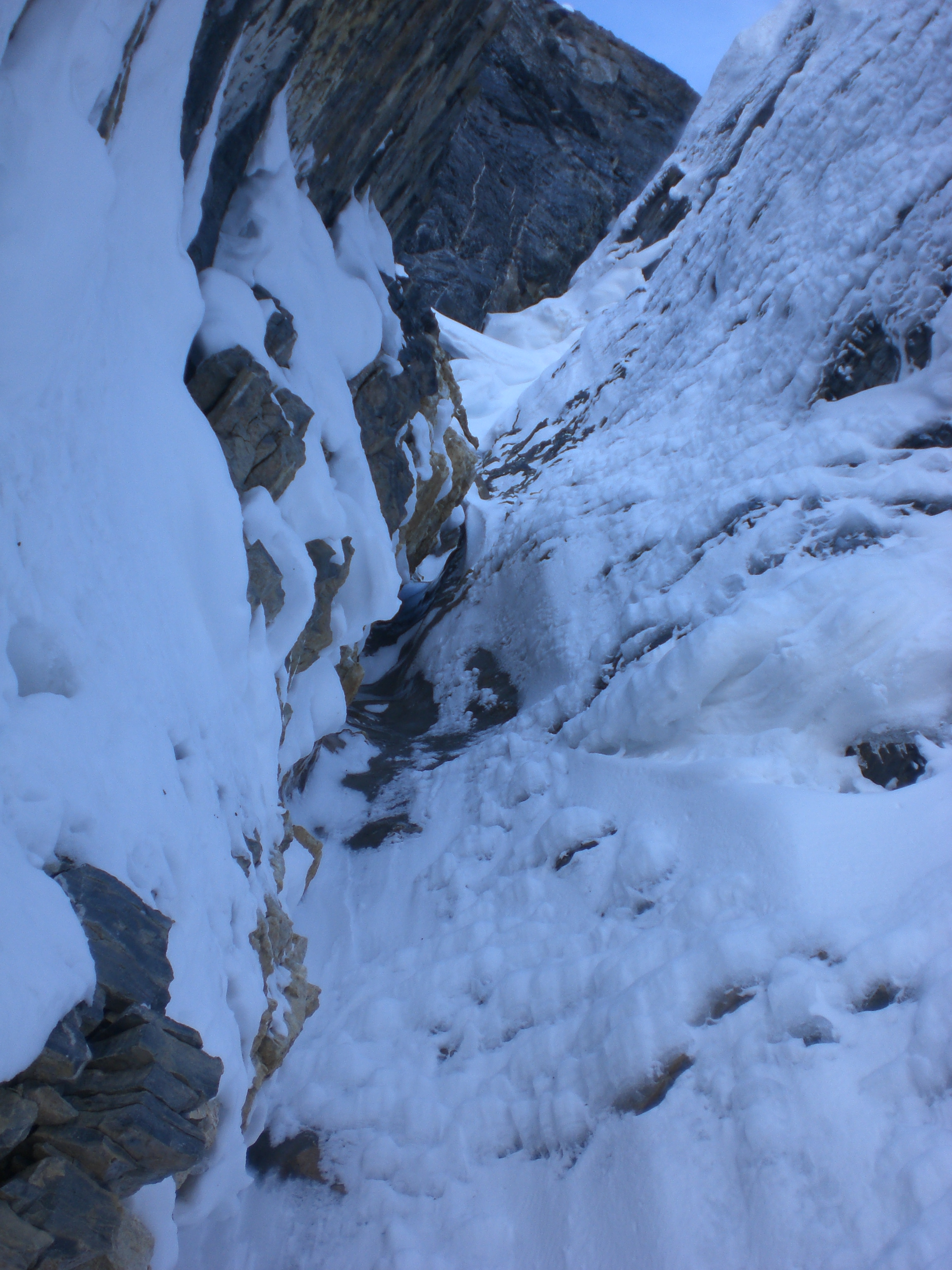 Some snow had built up at the bottom of the icefield, allowing us to stand flat-footed, sort of, so we stopped and sharpened our tools. It wasn’t much of a break, but it looked like the best we would get for a while. Several hundred meters of featureless alpine ice followed, with a small step at the top. Cresting the step, we got our first look into the upper gully.